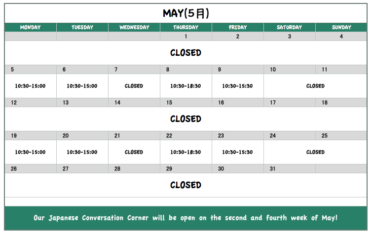 Starting from May 19th (Monday), we will be opening our doors every two weeks to those who want to casually practice their Japanese.