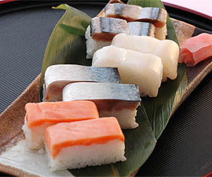 One is OSHIZUSHI(押し寿司), often made with Mackerel(サバ)and vinegared rice. Since it can be made so quickly and simple way, people always enjoyed OSHIZUSHI(押し寿司)easily.
