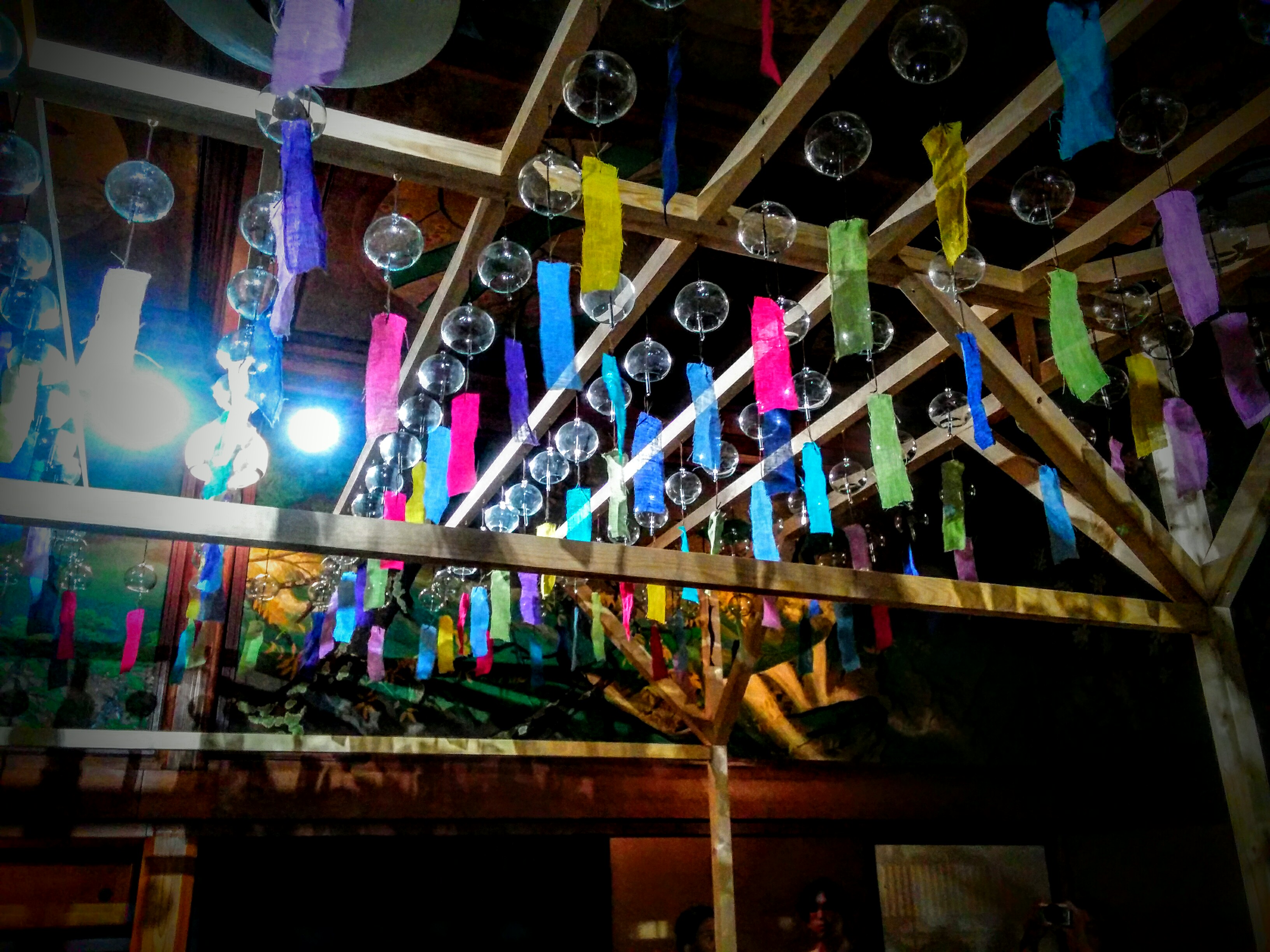 You might find the sound of wind-bell(風鈴:FU-RIN) under the eaves, or the sound of fireworks(花火:HANABI). There are a lot of sounds which only can be heard in particular season in Japan.